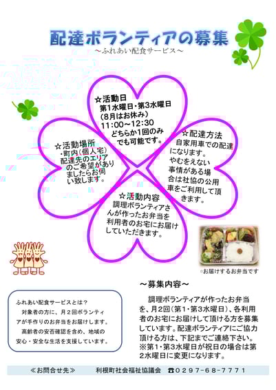 16日 1月 2020 配達ボランティアの募集 ふれあい配食サービス事業のお弁当を届けてくださる方を募集しております! 調理ボランティアが作ったお弁当を月2回(第1・第3水曜日)、各利用者のお宅にお届けしています。 配達ボランティアにご興味・ご協力頂ける方は、下記までご連絡ください。 お問い合わせ先:0297‐68‐7771 tagPlaceholderカテゴリ: お知らせ