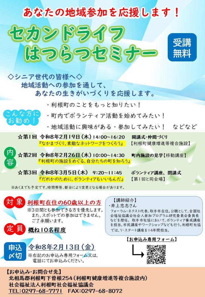 プなども行う。利根町社協では、リ・スタート講座の講師を14年間担当。令和6年度より当セミナーの講